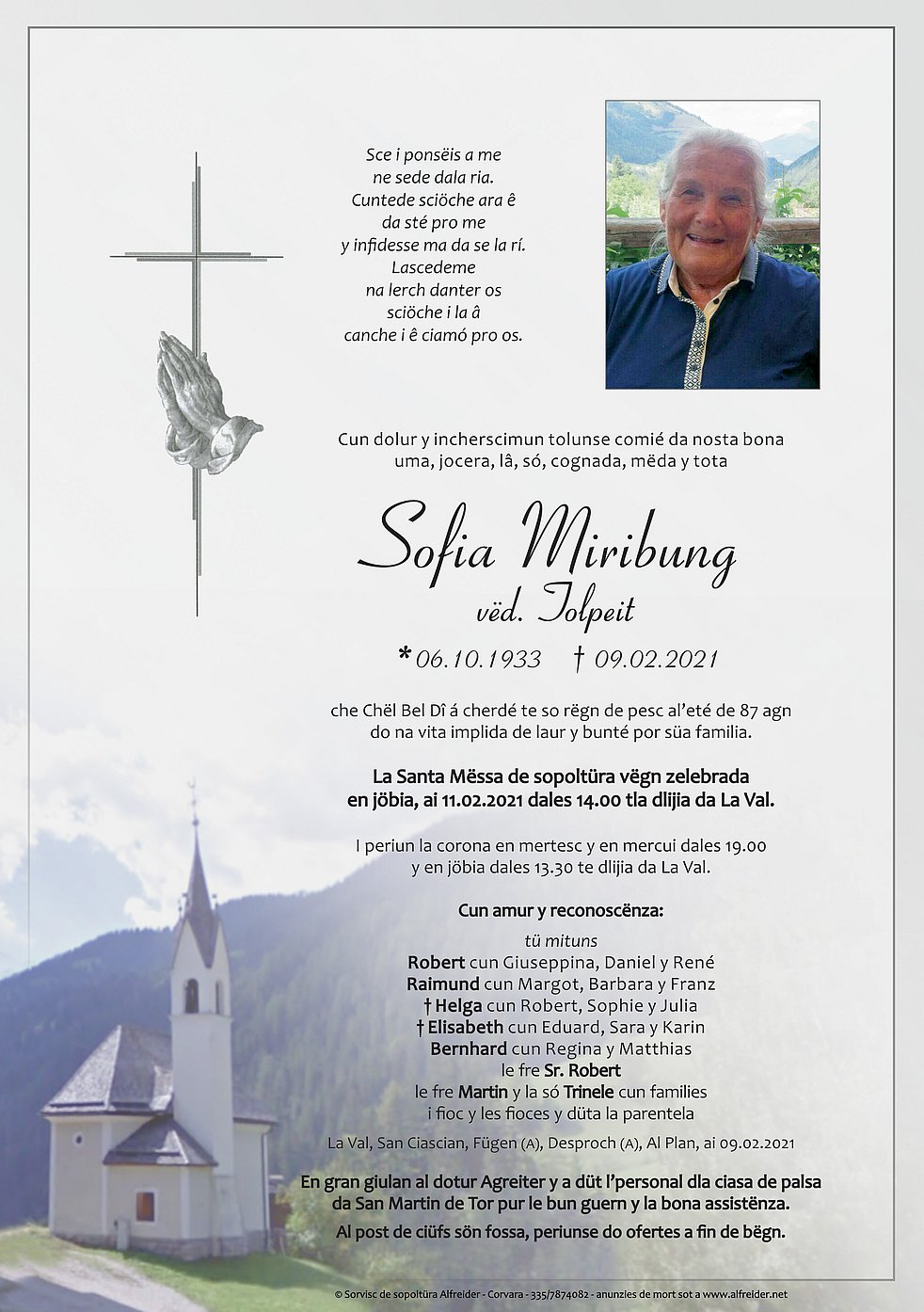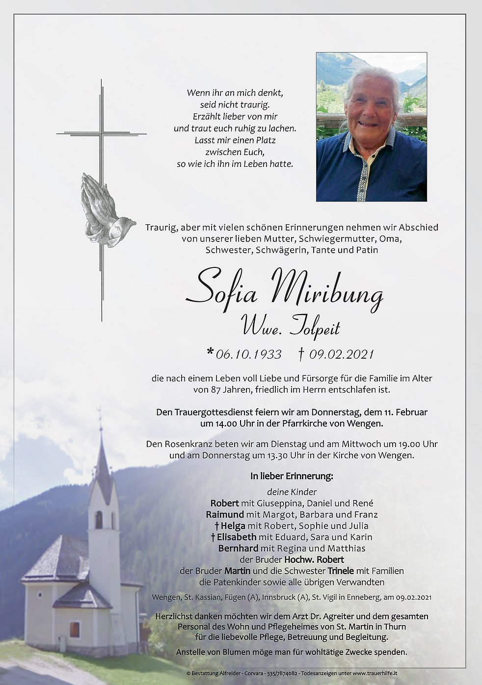 Den Trauergottesdienst feiern wir am Donnerstag, dem 11. Februar um 14.00 Uhr in der Pfarrkirche von Wengen.