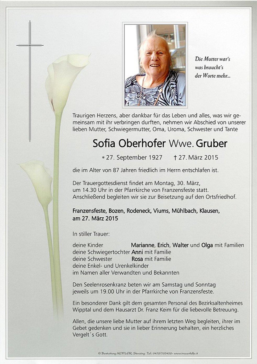 Traurigen Herzens, aber dankbar für das Leben und alles, was wir gemeinsam mit ihr verbringen durften, nehmen wir Abschied von unserer lieben Mutter, Schwiegermutter,
