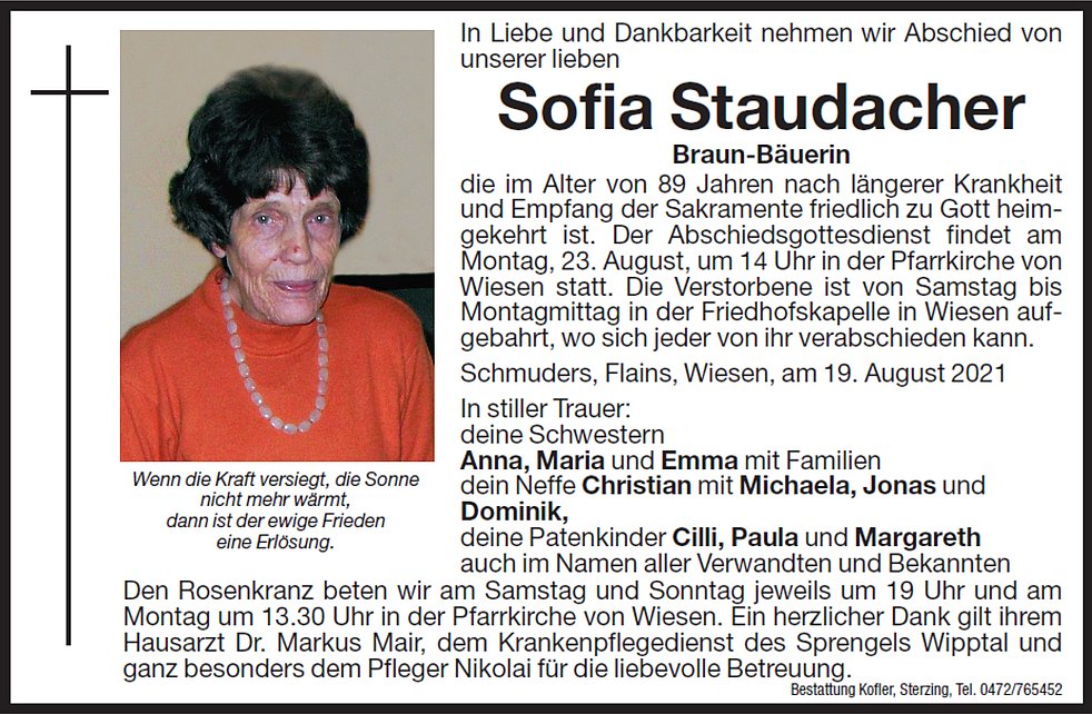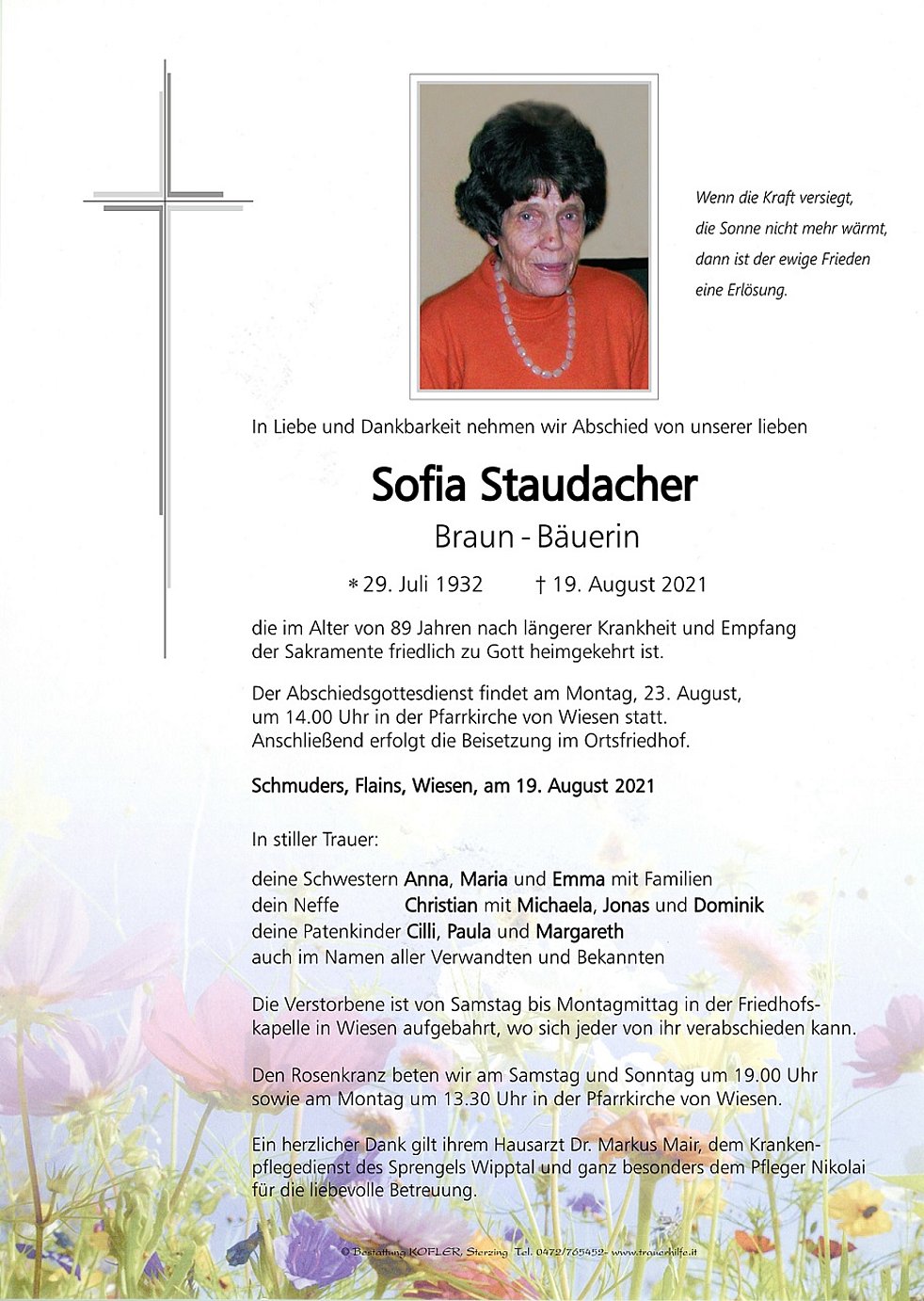 Ein herzlicher Dank gilt ihrem Hausarzt Dr. Markus Mair, dem Krankenpflegedienst des Sprengels Wipptal und ganz besonders dem Pfleger Nikolai für die liebevolle Betreuung.