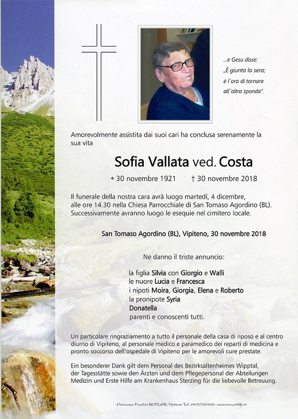 Il funerale della nostra cara avrà luogo martedí, 4 dicembre, alle ore 14.30 nella Chiesa Parrocchiale di San Tomaso Agordino (BL). Successivamente avranno luogo le esequie nel cimitero locale.