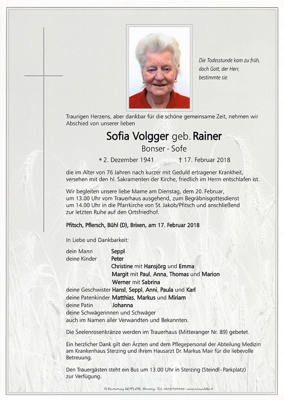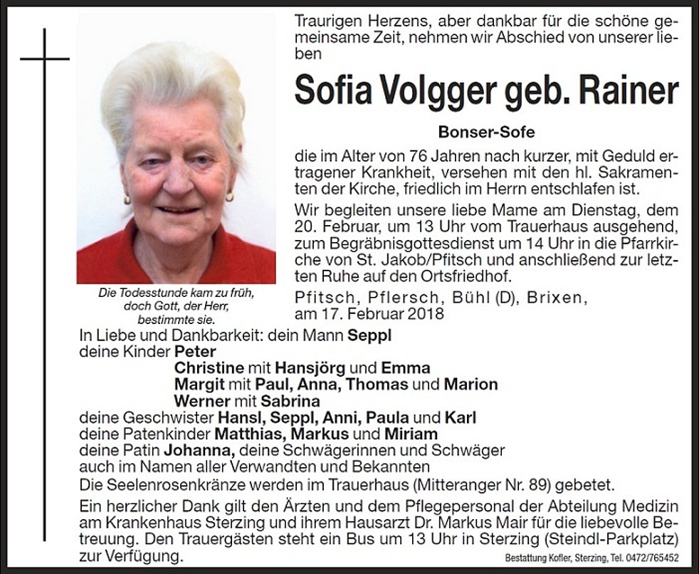 Wir begleiten unsere liebe Mame am Dienstag, dem 20. Februar, um 13.00 Uhr vom Trauerhaus ausgehend, zum Begräbnisgottesdienst um 14.00 Uhr in die Pfarrkirche von St. Jakob/Pfitsch und anschließend zur letzten Ruhe auf den Ortsfriedhof.