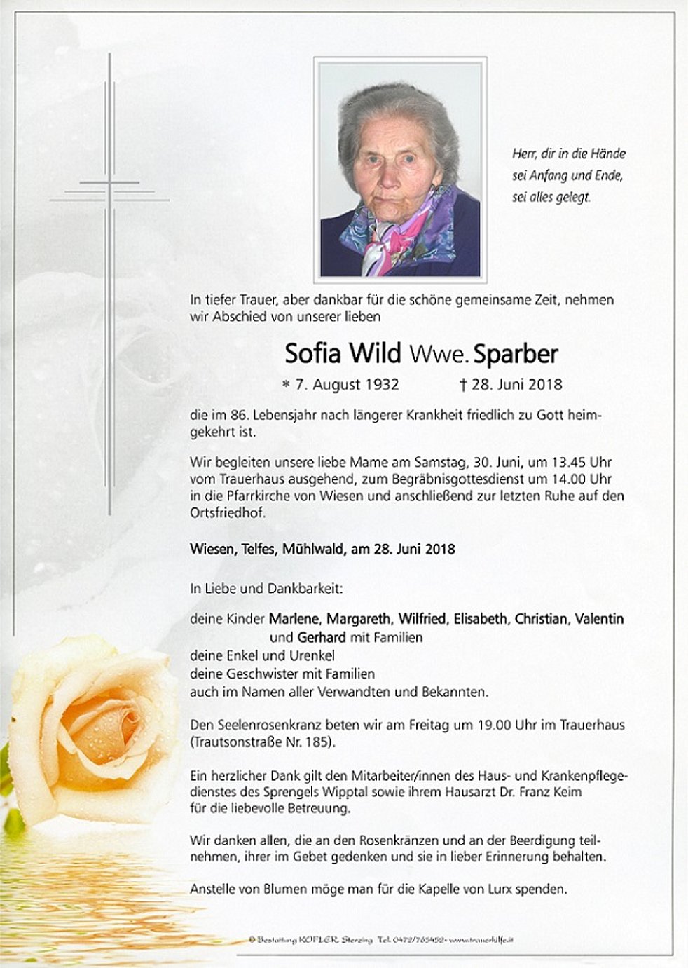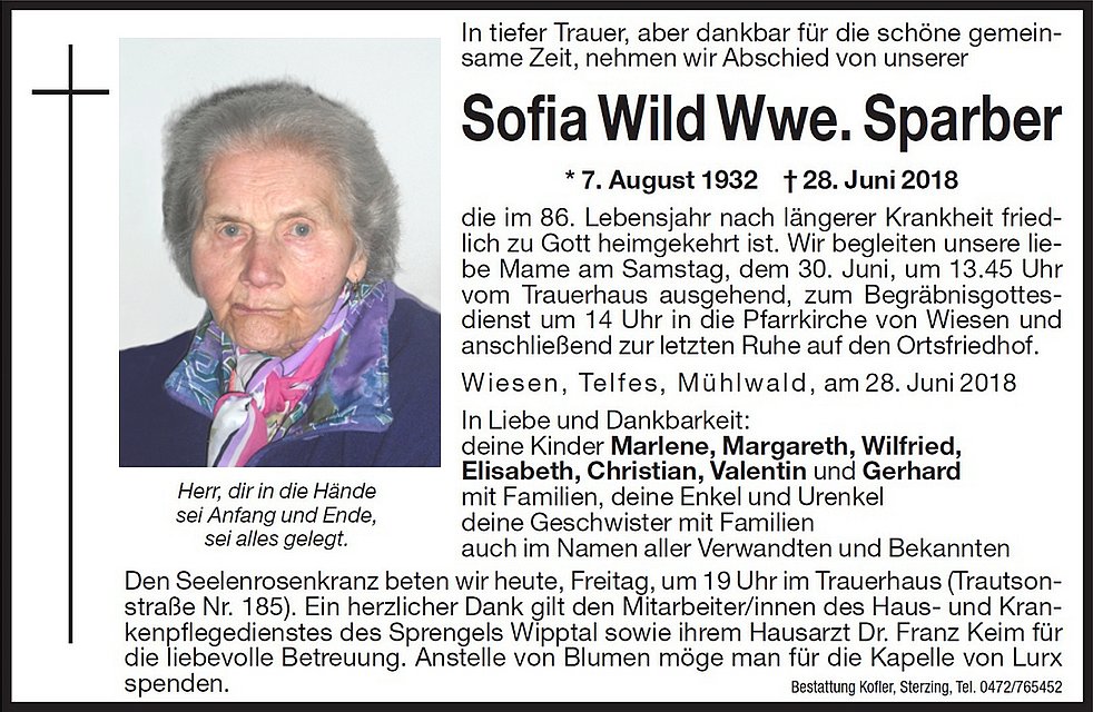 Ein herzlicher Dank gilt den Mitarbeiter/innen des Haus- und Krankenpflegedienstes des Sprengels Wipptal sowie ihrem Hausarzt Dr. Franz Keim für die liebevolle Betreuung.