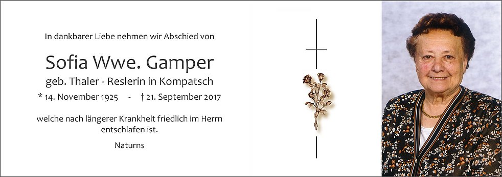 Den Trauergottesdienst für unsere liebe Verstorbene feiern wir am Samstag, den 23. September, um 14.30 Uhr, in der Pfarrkirche von Naturns. Anschließend begleiten wir sie auf den Ortsfriedhof zur letzten Ruhe.