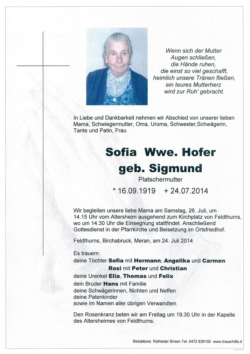 Wir begleiten unsere liebe Mama am Samstag, 26. Juli, um 14.15 Uhr vom Altersheim ausgehend zum Kirchplatz von Feldthurns, wo um 14.30 Uhr die Einsegnung stattfindet. Anschließend Gottesdienst in der Pfarrkirche und Beisetzung im Ortsfriedhof.