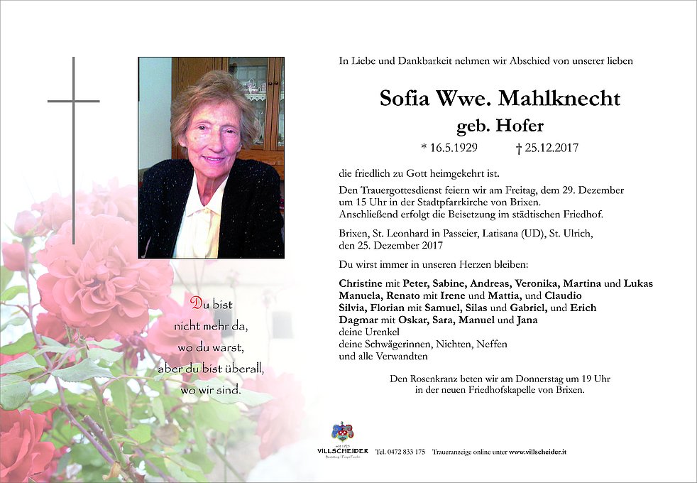 Den Trauergottesdienst feiern wir am Freitag, dem 29. Dezember,