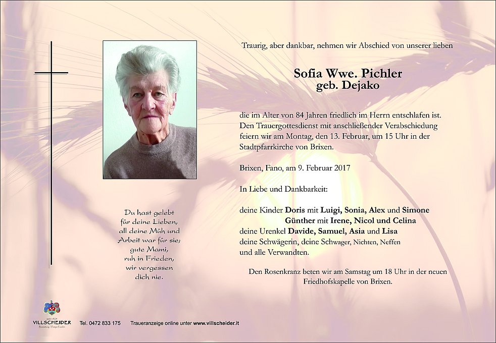 Den Trauergottesdienst mit anschließender Verabschiedung feiern wir am Montag, den 13. Februar, um 15 Uhr in der Stadtpfarrkirche von Brixen.