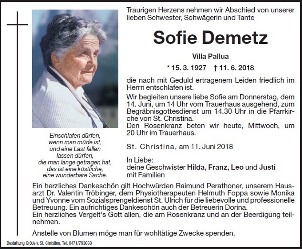 Ein herzliches Dankeschön gilt Hochwürden Raimund Perathoner, unserem Hausarzt Dr. Valentin Tröbinger, dem Physiotherapeuten Helmuth Foppa sowie Monika und Yvonne vom Sozialsprengeldienst St. Ulrich für die liebevolle und professionelle Betreuung. Ein aufrichtiges Dankeschön auch der Betreuerin Dorina.