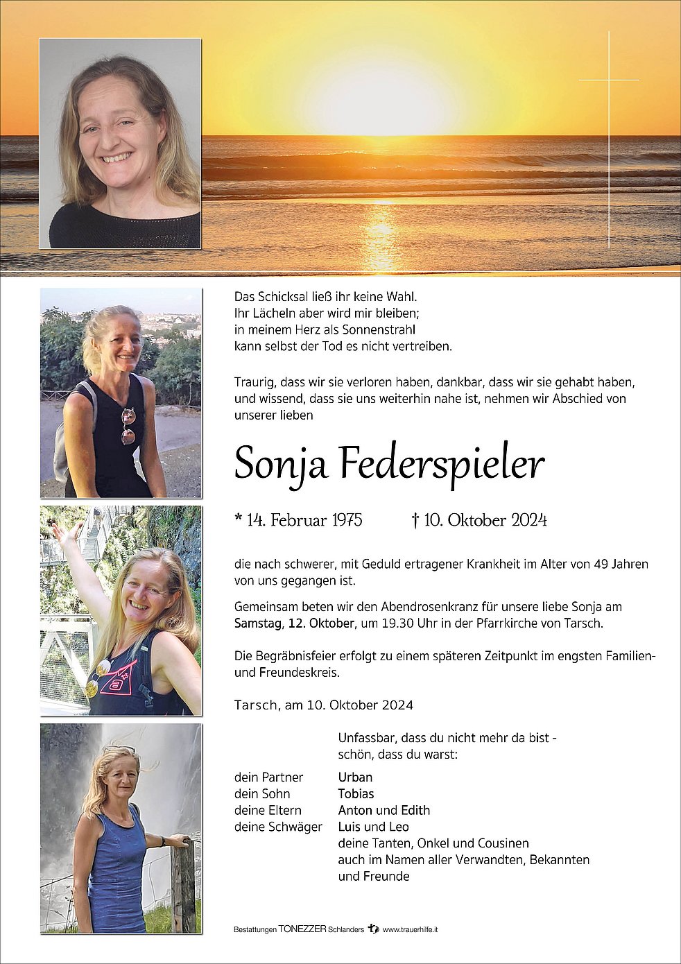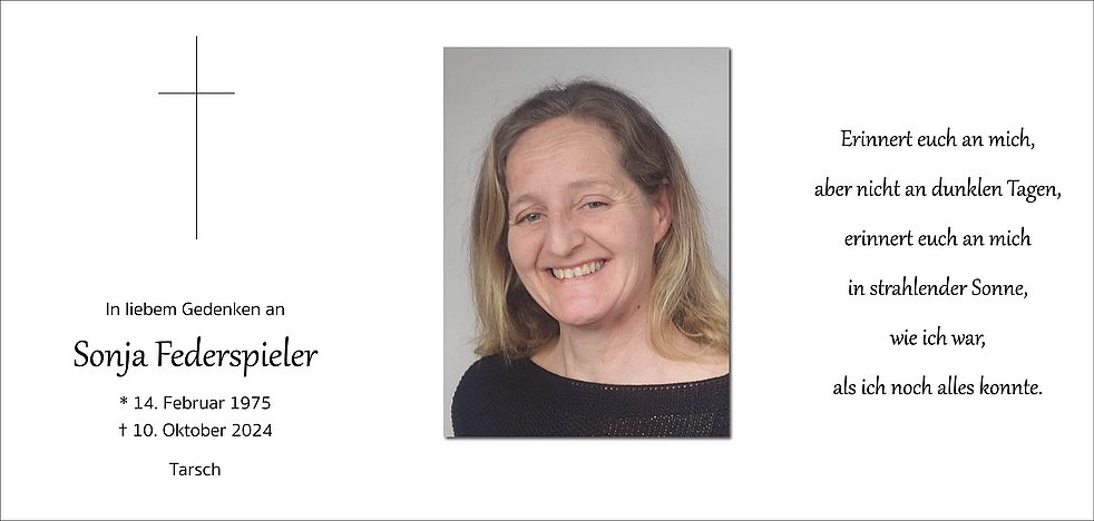 Lieber Tobias, lieber Toni, liebe Edith, lieber Urban ich wünsche euch und allen, denen Sonja unendlich fehlen wird, von ganzen Herzen, dass ihr die notwendige Kraft bekommt, trotz des für euch so schmerzlichen Verlustes zuversichtlich und nicht hoffnungslos in die Zukunft zu blicken. Ohnmächtig und hilflos vor Trauer und Schmerz möchte ich euch mein tiefes Mitgefühl ausdrücken.