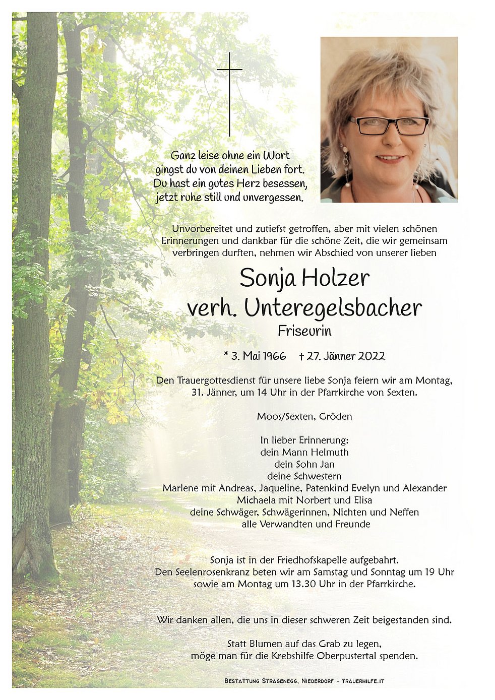 Den Trauergottesdienst für unsere liebe Sonja feiern wir am Montag, 31. Jänner, um 14 Uhr in der Pfarrkirche von Sexten.