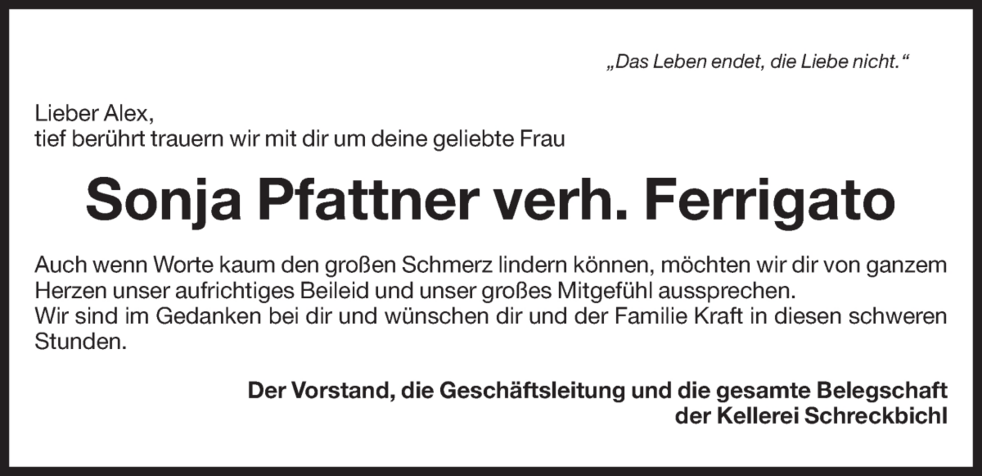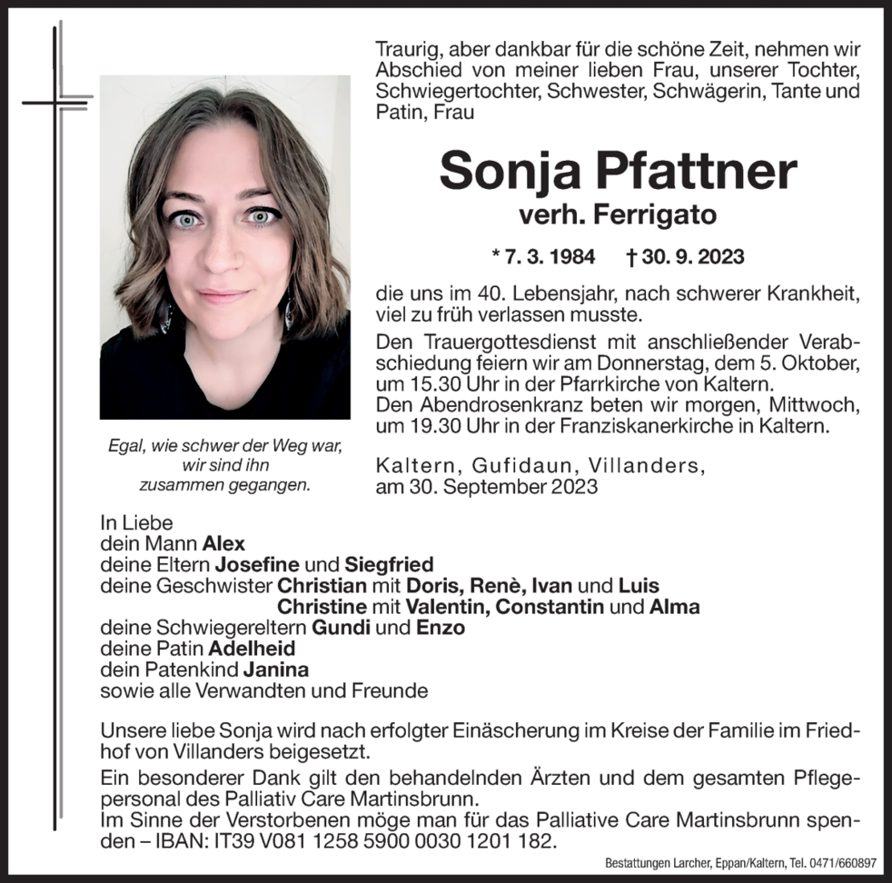 Im Sinne der Verstorbenen möge man für das Palliative Care Martinsbrunn (IBAN: IT39 V0811 25859 00003 01201 182) spenden.