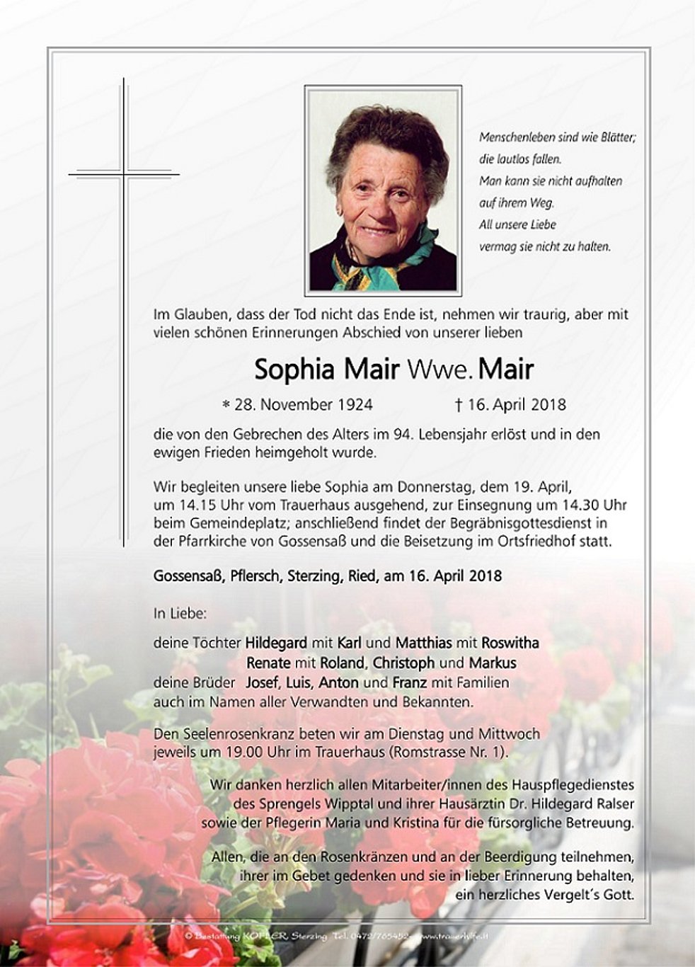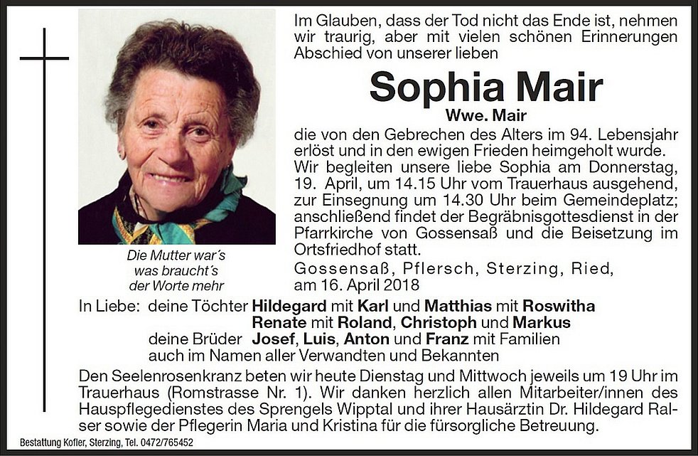Wir begleiten unsere liebe Sophia am Donnerstag, dem 19. April, um 14.15 Uhr vom Trauerhaus ausgehend, zur Einsegnung um 14.30 Uhr beim Gemeindeplatz; anschließend findet der Begräbnisgottesdienst in der Pfarrkirche von Gossensaß und die Beisetzung im Ortsfriedhof statt.