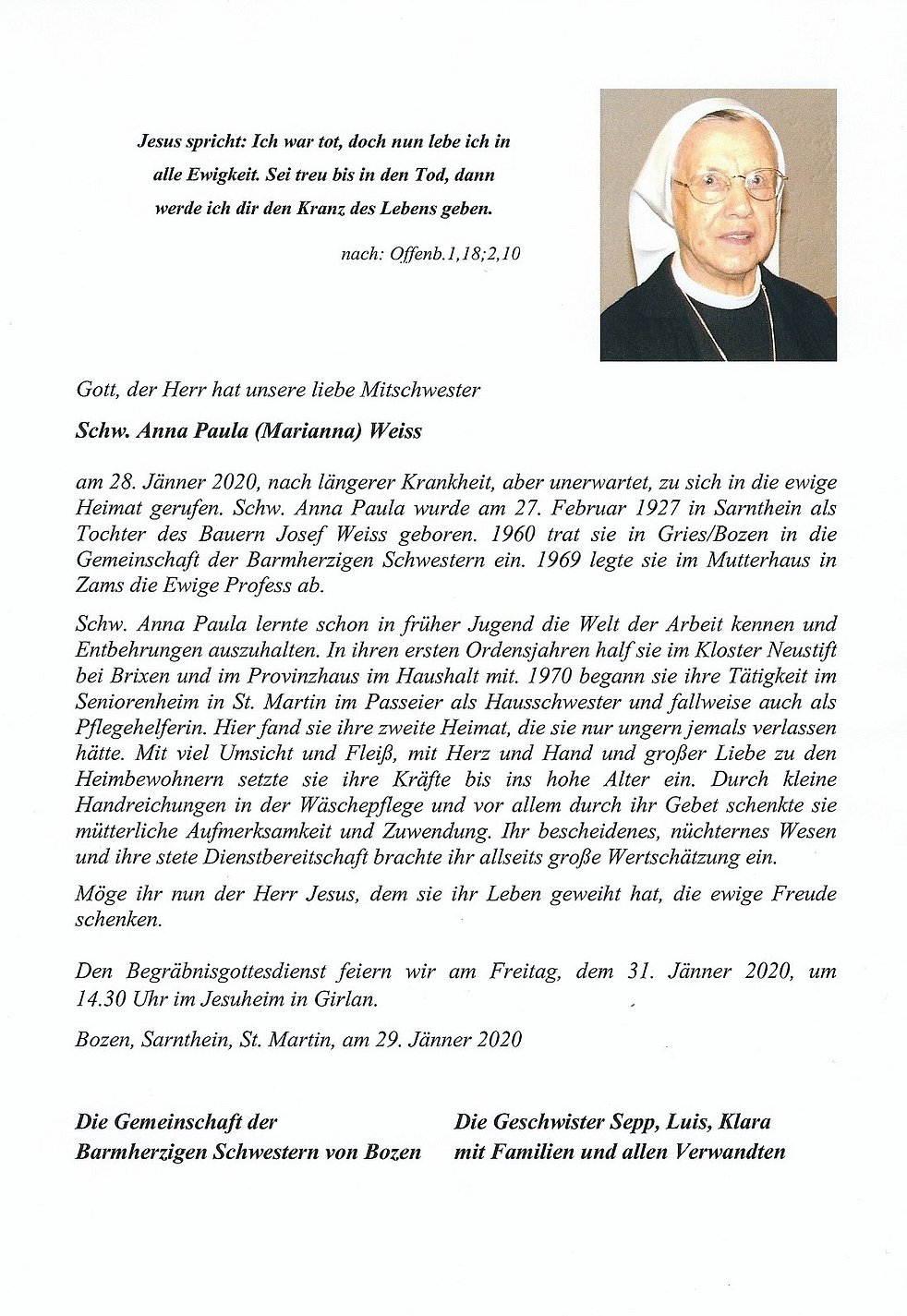 Den Begräbnisgottesdienst feiern wir am Freitag, dem 31. Jänner, um 14.30 Uhr im Jesuheim in Girlan.