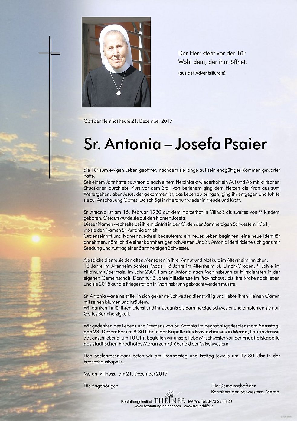 Diesen Namen wechselte bei ihrem Eintritt in den Orden der Barmherzigen Schwestern 1961, wo sie den Namen Sr. Antonia erhielt. Als Barmherzige Schwester solche diente sie den alten Menschen in ihrer Armut und Not kurz im Altersheim Innichen, 12 Jahre im Altenheim Schloss Moos, 18 Jahre im Altersheim St. Ulrich/Gröden, 9 Jahre im Filipinum Obermais. Im Jahr 2000 kam Sr. Antonia nach Martinsbrunn zu Hilfsdiensten in der eigenen Gemeinschaft.