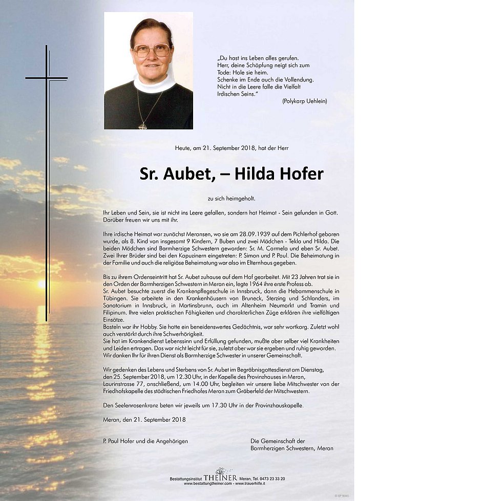 Ihre irdische Heimat war zunächst Meransen, wo sie am 28.09.1939 auf dem Pichlerhof geboren wurde, als 8. Kind von insgesamt 9 Kindern, 7 Buben und zwei Mädchen - Tekla und Hilda. Die beiden Mädchen sind Barmherzige Schwestern geworden: Sr. M. Carmela und eben Sr. Aubet. Zwei Ihrer Brüder sind bei den Kapuzinern eingetreten: P. Simon und P. Paul. Die Beheimatung in der Familie und auch die religiöse Beheimatung war also im Elternhaus gegeben.