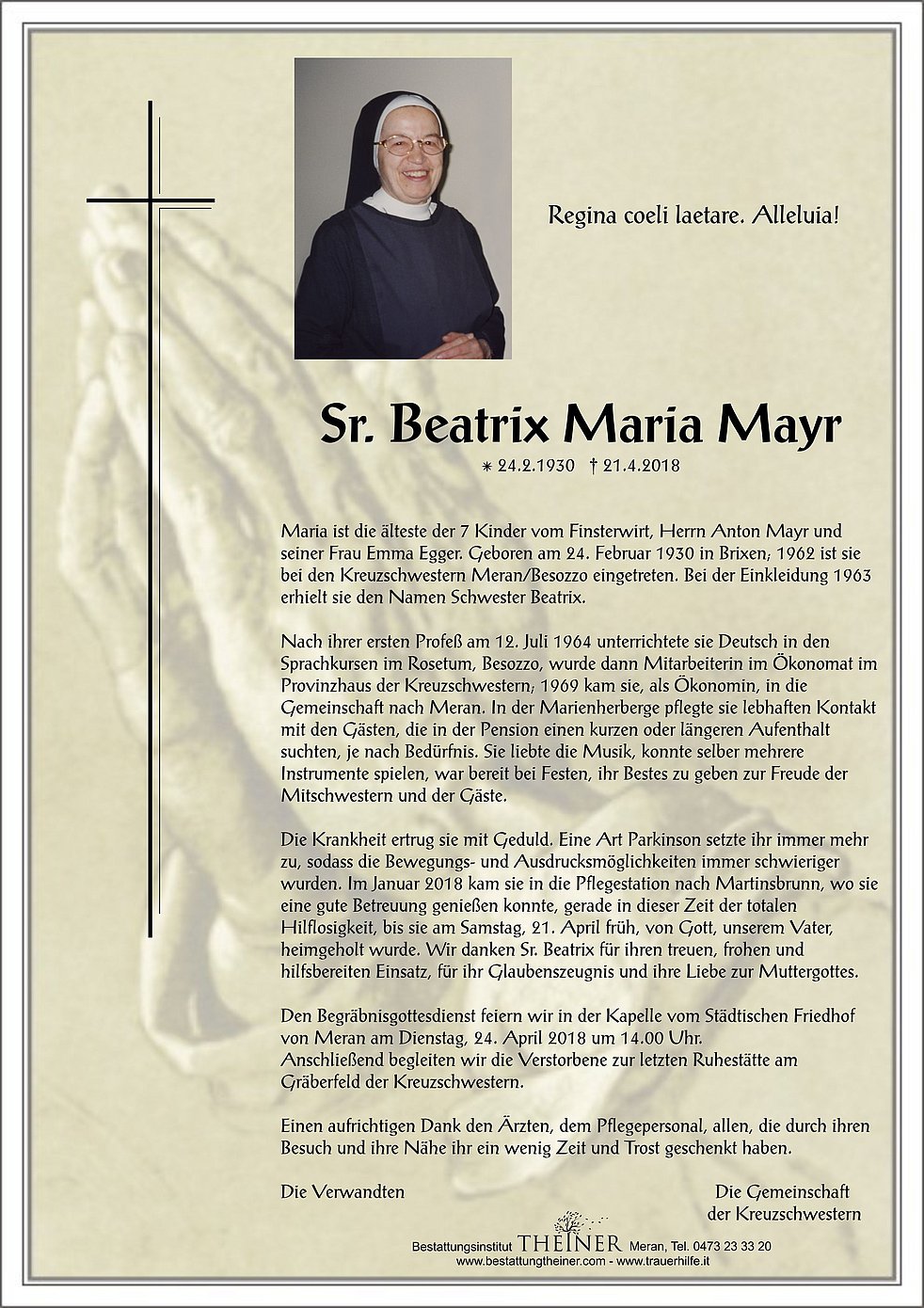 Den Begräbnisgottesdienst feiern wir in der Kapelle vom Städtischen Friedhof von Meran am Dienstag, 24. April 2018 um 14.00 Uhr. Anschließend begleiten wir die Verstorbene zur letzten Ruhestätte am Gräberfeld der Kreuzschwestern.