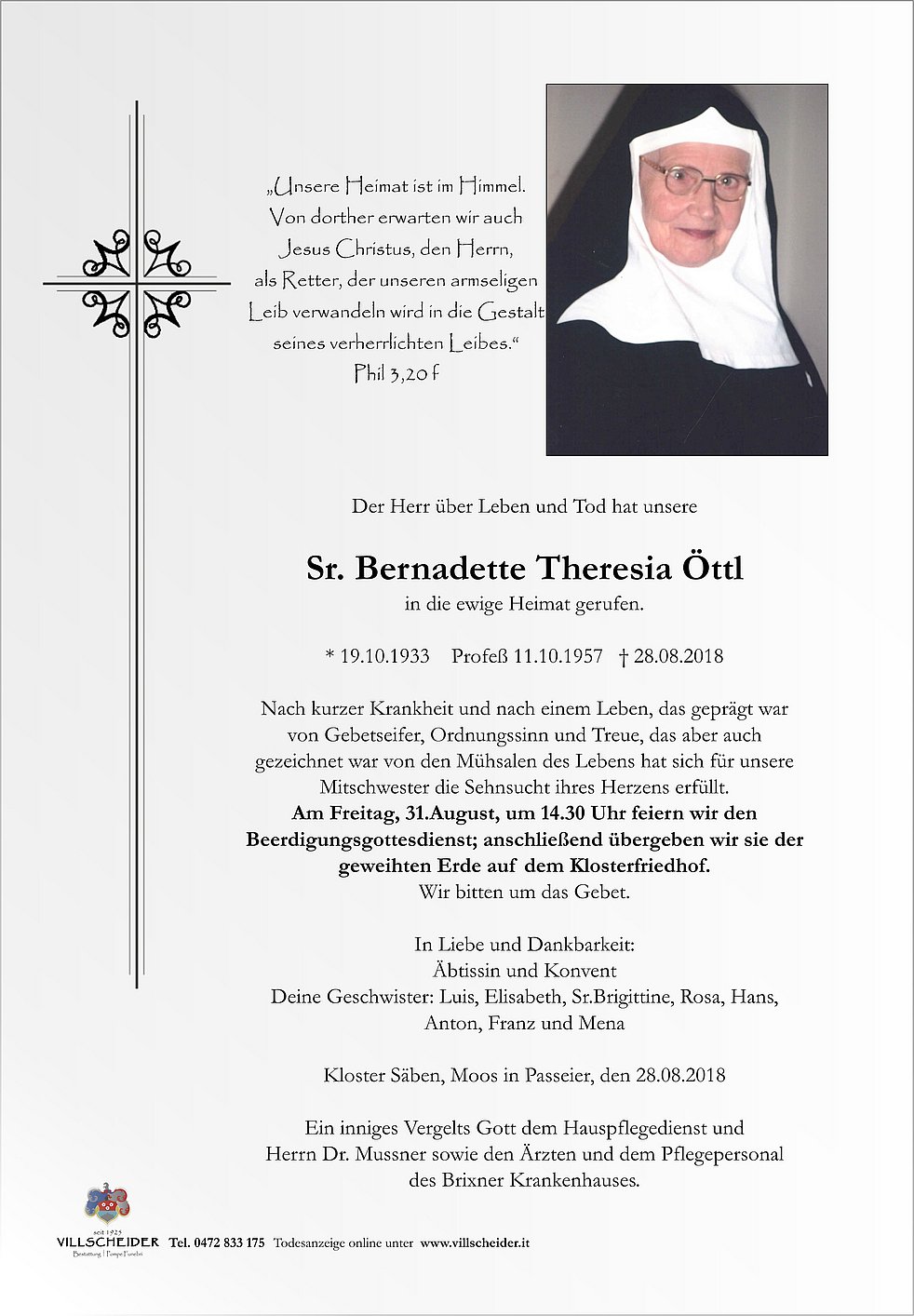 Am Freitag, 31.August, um 14.30 Uhr feiern wir den Beerdigungsgottesdienst; anschließend übergeben wir sie der geweihten Erde auf dem Klosterfriedhof.