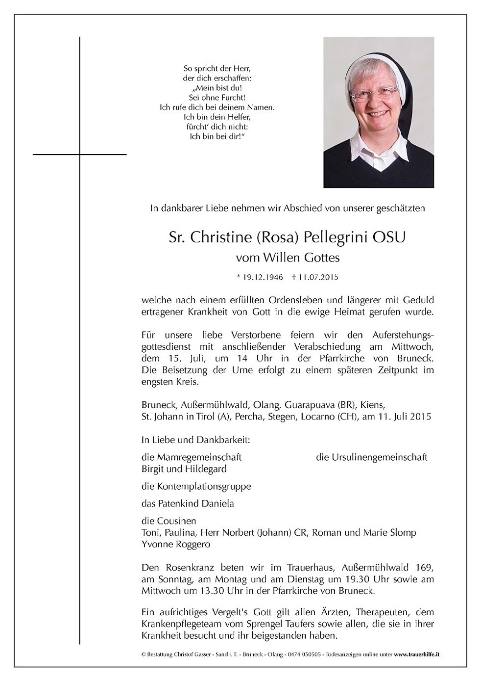 Den Rosenkranz beten wir im Trauerhaus, Außermühlwald 169, am Sonntag, am Montag und am Dienstag um 19.30 Uhr sowie am Mittwoch um 13.30 Uhr in der Pfarrkirche von Bruneck.