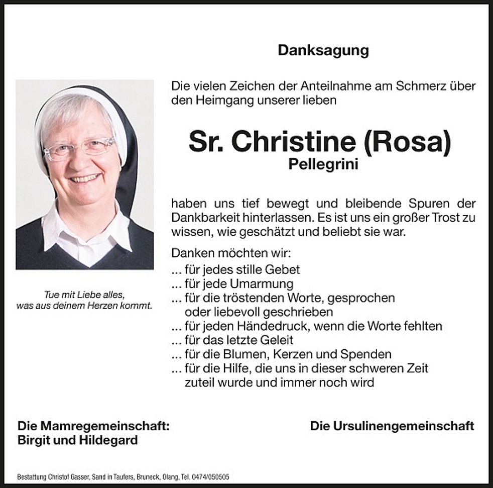 Ein aufrichtiges Vergelt's Gott gilt allen Ärzten, Therapeuten, dem Krankenpflegeteam vom Sprengel Taufers sowie allen, die sie in ihrer Krankheit besucht und ihr beigestanden haben.
