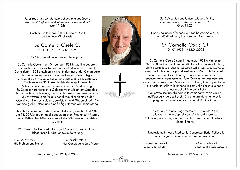 Begräbnisgottesdienst: 16.04. - 14:00 Uhr Meran