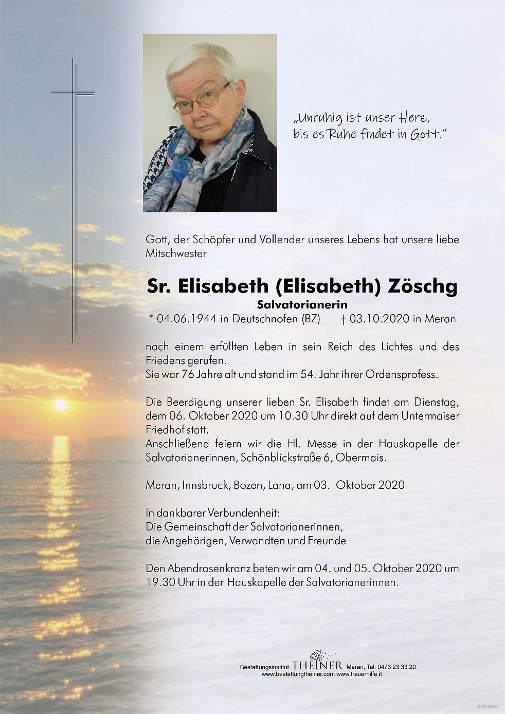 Die Beerdigung unserer lieben Sr. Elisabeth findet am Dienstag, dem 06. Oktober 2020 um 10.30 Uhr direkt auf dem Untermaiser Friedhof statt.