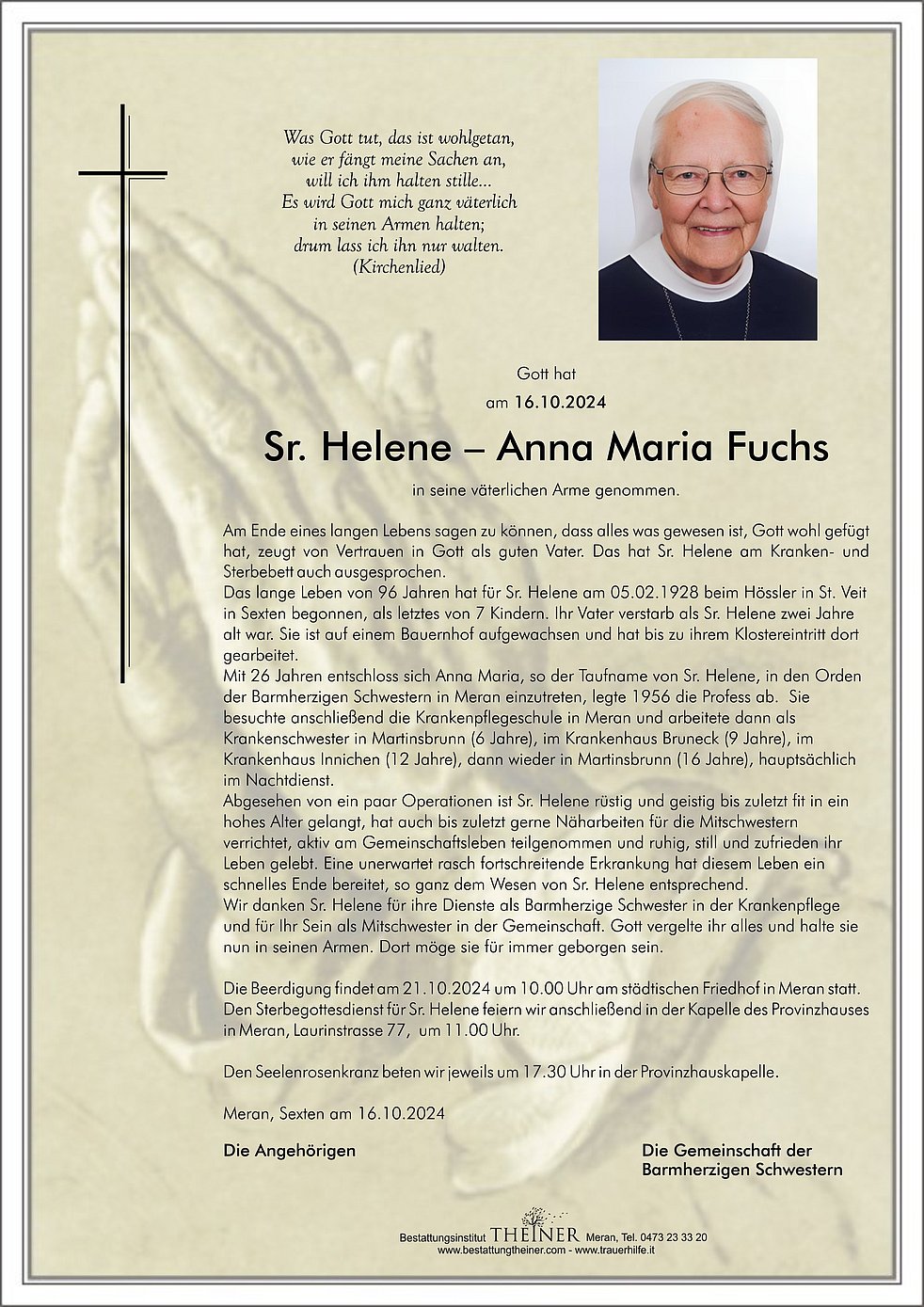 Mit 26 Jahren entschloss sich Anna Maria, so der Taufname von Sr. Helene, in den Orden der Barmherzigen Schwestern in Meran einzutreten, legte 1956 die Profess ab. Sie besuchte anschließend die Krankenpflegeschule in Meran und arbeitete dann als Krankenschwester in Martinsbrunn (6 Jahre), im Krankenhaus Bruneck (9 Jahre), im Krankenhaus Innichen (12 Jahre), dann wieder in Martinsbrunn (16 Jahre), hauptsächlich im Nachtdienst.