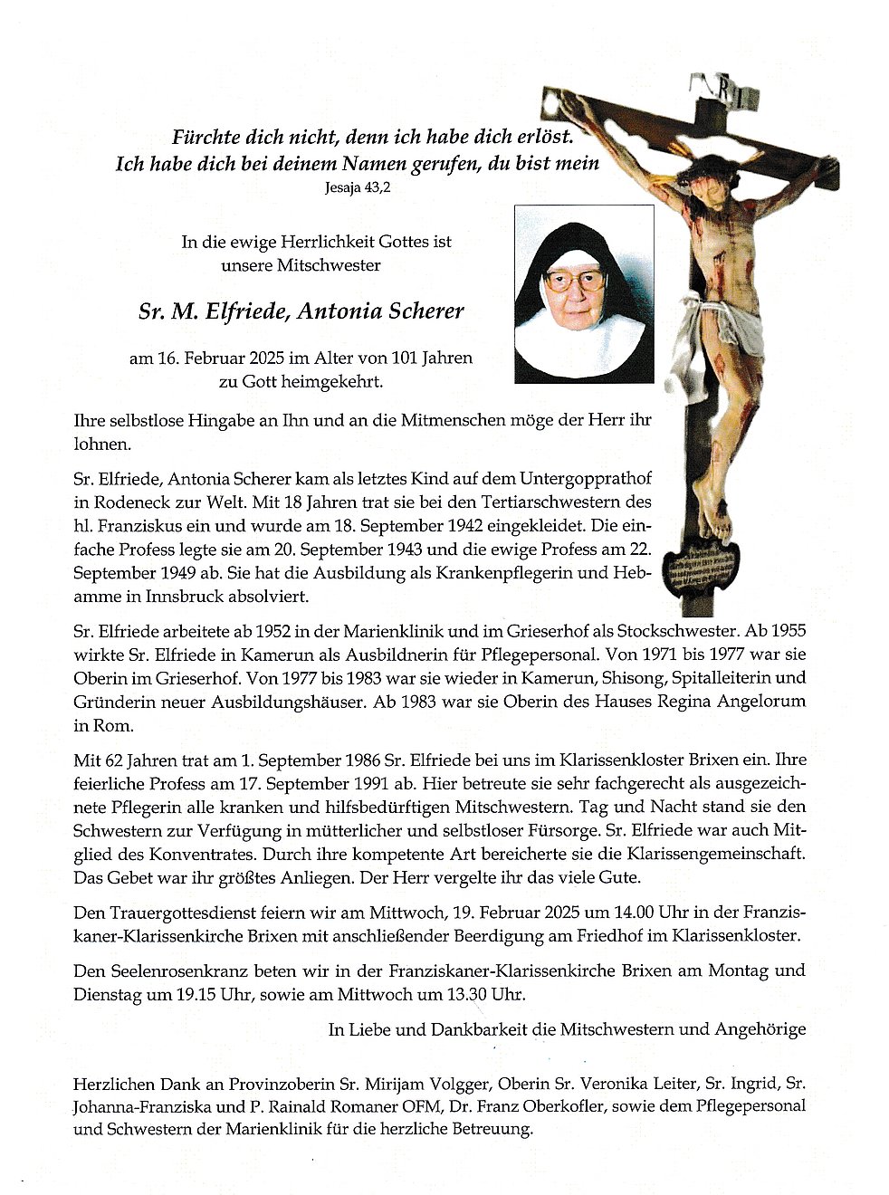Begräbnisgottesdienst: 19.02. - 14:00 Uhr Franziskaner-Klarissenkirche Brixen