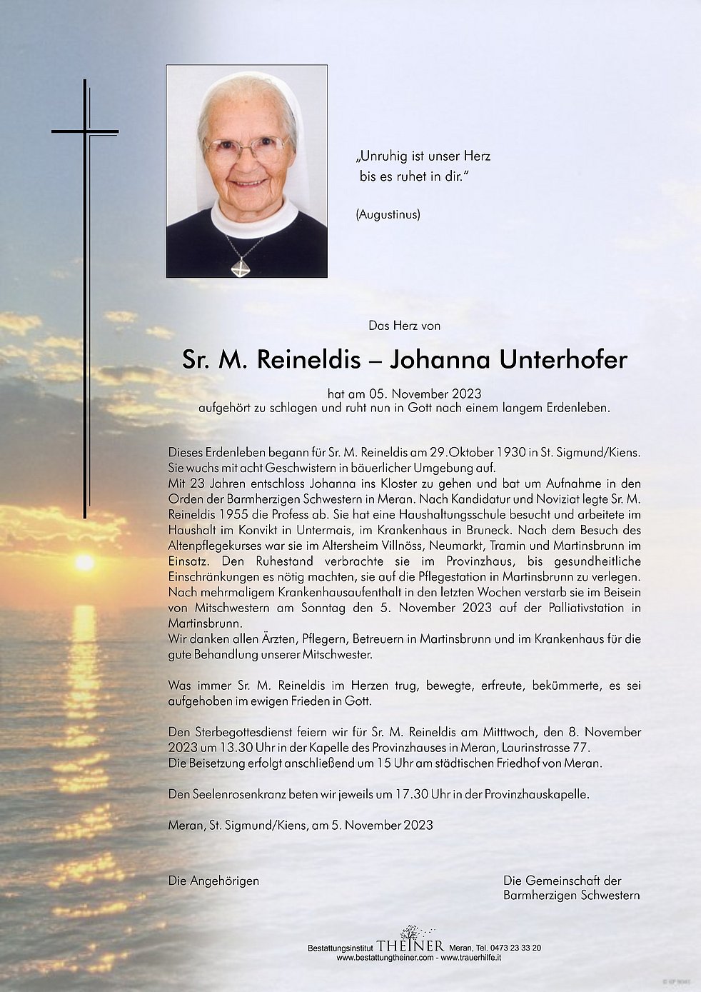 Mit 23 Jahren entschloss Johanna ins Kloster zu gehen und bat um Aufnahme in den Orden der Barmherzigen Schwestern in Meran. Nach Kandidatur und Noviziat legte Sr. M. Reineldis 1955 die Profess ab. Sie hat eine Haushaltungsschule besucht und arbeitete im Haushalt im Konvikt in Untermais, im Krankenhaus in Bruneck. Nach dem Besuch des Altenpflegekurses war sie im Altersheim Villnöss, Neumarkt, Tramin und Martinsbrunn im Einsatz. Den Ruhestand verbrachte sie im Provinzhaus, bis gesundheitliche Einschränkungen es nötig machten, sie auf die Pflegestation in Martinsbrunn zu verlegen. Nach mehrmaligem Krankenhausaufenthalt in den letzten Wochen verstarb sie im Beisein von Mitschwestern am Sonntag den 5. November 2023 auf der Palliativstation in Martinsbrunn.
