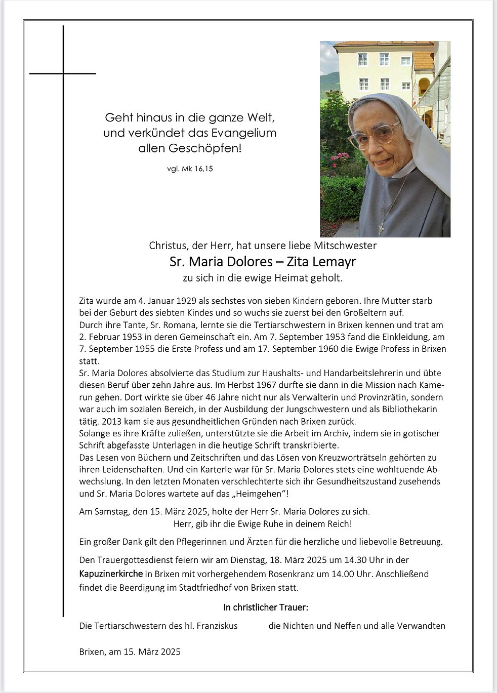 Begräbnisgottesdienst: 18.03. - 14:30 Uhr Kapuzinerkirche Brixen
