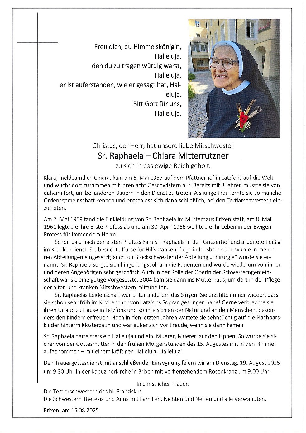 Begräbnisgottesdienst: 19.08. - 09:30 Uhr Kapzunerkirche Brixen