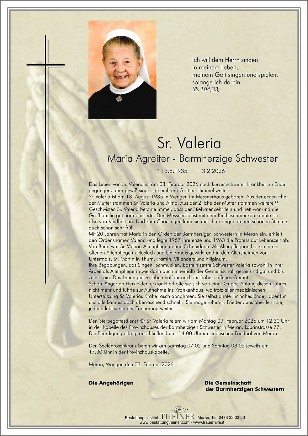 Den Sterbegottesdienst für Sr. Valeria feiern wir am Montag 09. Februar 2026 um 12.30 Uhr in der Kapelle des Provinzhauses der Barmherzigen Schwester in Meran, Laurinstrasse 77.