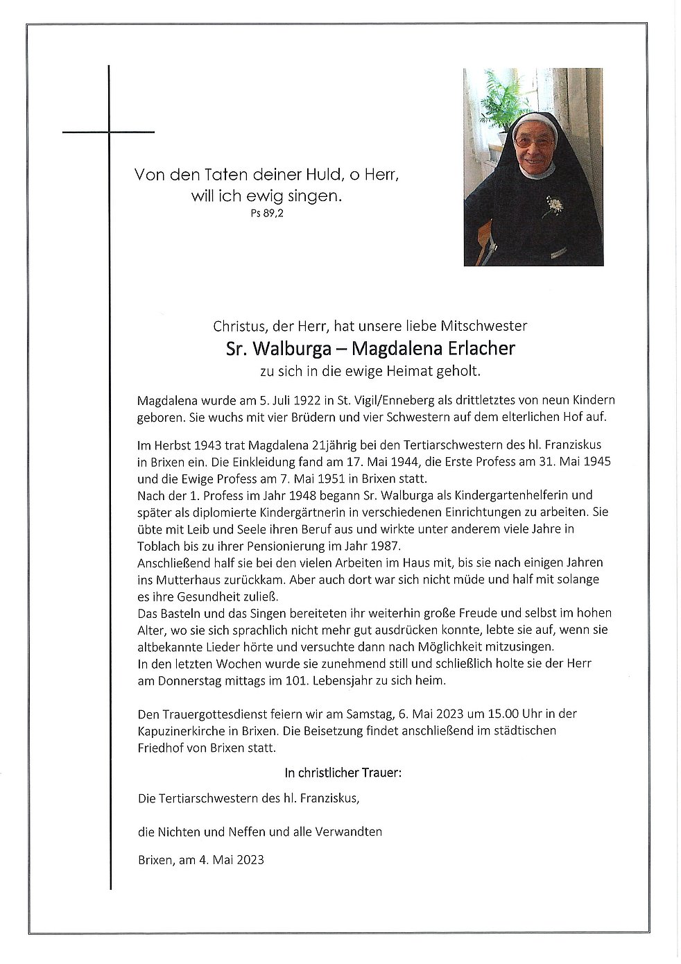 Liebe Schwester Walburga! Es gibt Menschen, die hinterlassen Spuren im Leben anderer Menschen. Sie waren so ein Mensch. Als meine liebevolle Kindergartentante in Toblach haben sie besondere Spuren in meinem Leben hinterlassen. Dafùr mòchte ich mich von Herzen bedanken.
