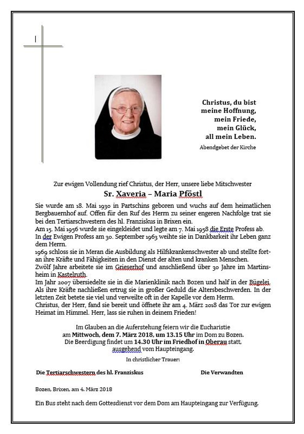 Christus, der Herr, fand sie bereit und öffnete ihr am 4. März 2018 das Tor zur ewigen Heimat im Himmel. Herr, lass sie ruhen in deinem Frieden!