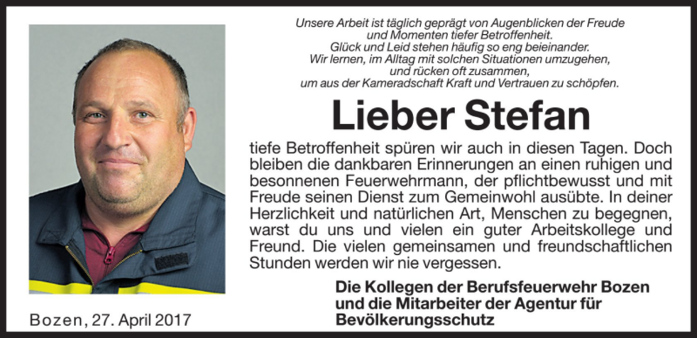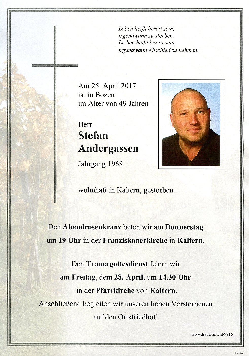 Den Abschiedsgottesdienst feiern wir am Freitag, dem 28. April um 14.30 Uhr in der Pfarrkirche von Kaltern. Anschließend begleiten wir unseren lieben Verstorbenen auf den Ortsfriedhof.