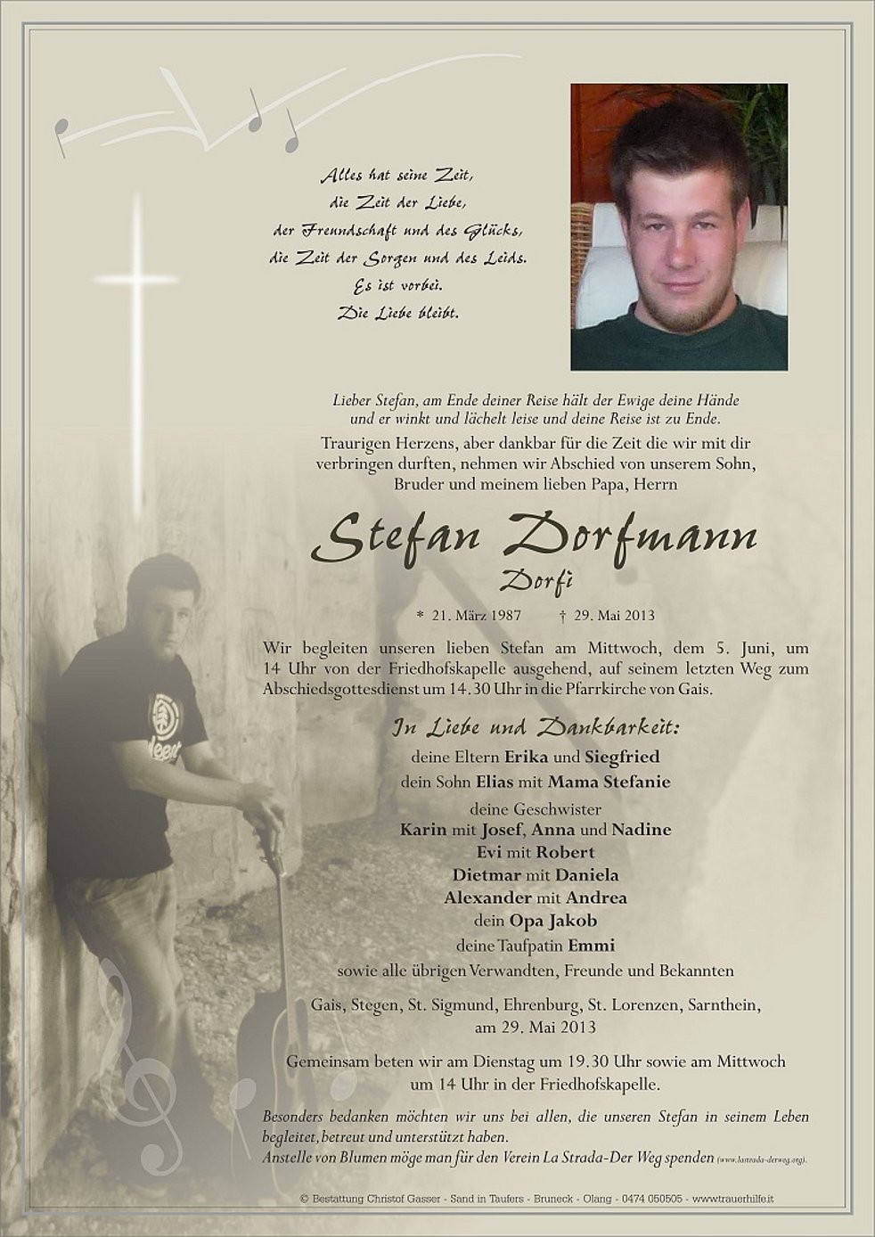 Anstelle von Blumen möge man für den Verein La Strada-Der Weg spenden (www.lastrada-derweg.org).