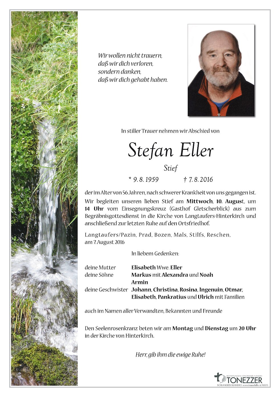 Wir begleiten unseren lieben Stief am Mittwoch, 10. August, um 14 Uhr vom Einsegnungskreuz (Gasthof Gletscherblick) aus zum Begräbnisgottesdienst in die Kirche von Langtaufers-Hinterkirch und anschließend zur letzten Ruhe auf den Ortsfriedhof.
