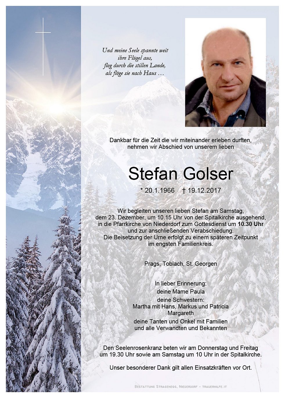 Wir begleiten unseren lieben Stefan am Samstag, dem 23. Dezember, um 10.15 Uhr von der Spitalkirche ausgehend, in die Pfarrkirche von Niederdorf zum Gottesdienst um 10.30 Uhr und zur anschließenden Verabschiedung.