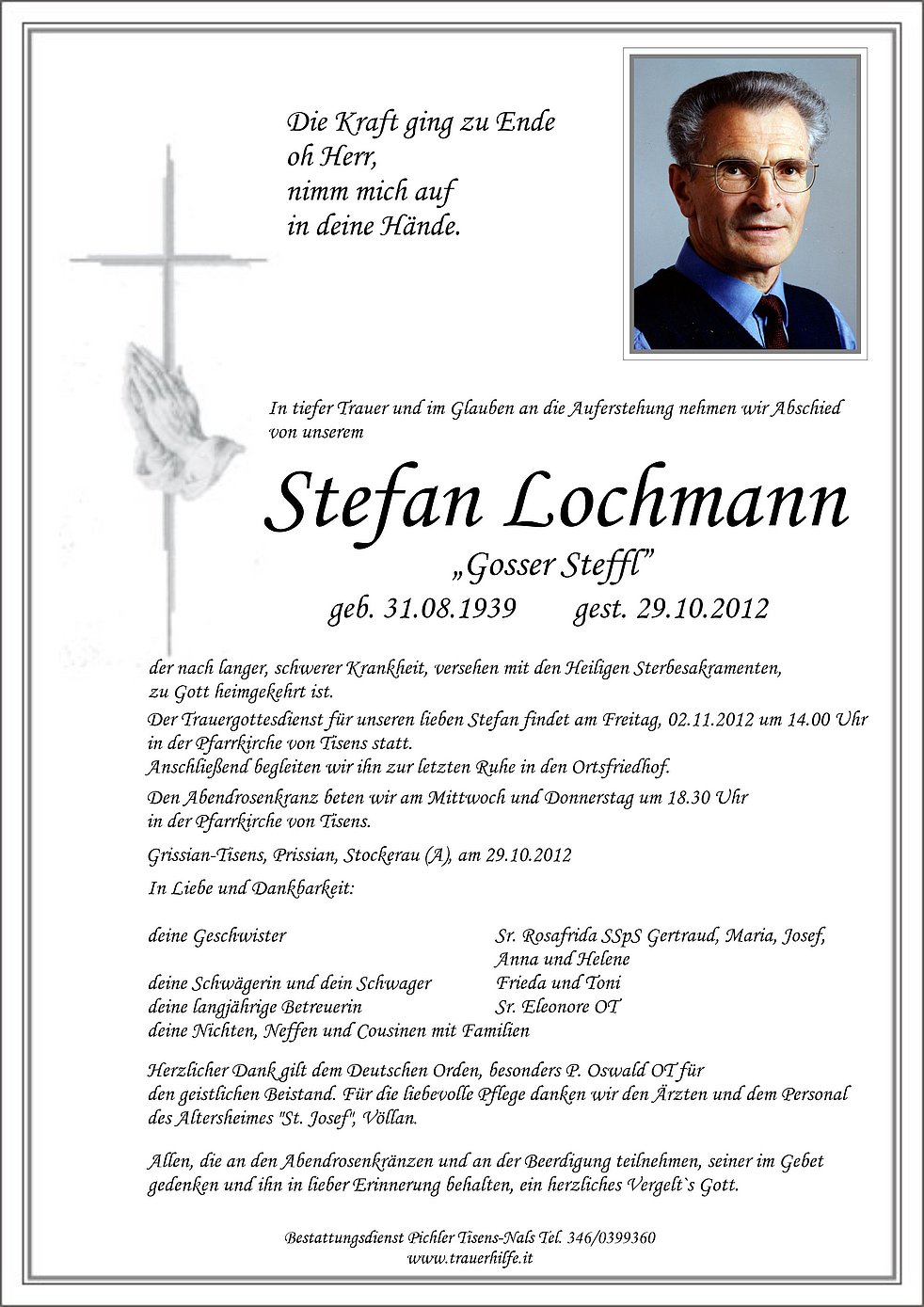 Die Kraft ging zu Ende oh Herr, nimm mich auf in deine Hände. In tiefer Trauer und im Glauben an die Auferstehung nehmen wir Abschied von unserem Stefan Lochmann „Gosser Steffl” geb. 31.08.1939 gest. 29.10.2012 der nach langer, schwerer Krankheit, versehen mit den Heiligen Sterbesakramenten, zu Gott heimgekehrt ist. Der Trauergottesdienst für unseren lieben Stefan findet am Freitag, 02.11.2012 um 14.00 Uhr in der Pfarrkirche von Tisens statt. Anschließend begleiten wir ihn zur letzten Ruhe in den Ortsfriedhof. Den Abendrosenkranz beten wir am Mittwoch und Donnerstag um 18.30 Uhr in der Pfarrkirche von Tisens. Grissian-Tisens, Prissian, Stockerau (A), am 29.10.2012 In Liebe und Dankbarkeit: deine Geschwister Sr. Rosafrida SSpS Gertraud, Maria, Josef, Anna und Helene deine Schwägerin und dein Schwager Frieda und Toni deine langjährige Betreuerin Sr. Eleonore OT deine Nichten, Neffen und Cousinen mit Familien Herzlicher Dank gilt dem Deutschen Orden, besonders P. Oswald OT für den geistlichen Beistand. Für die liebevolle Pflege danken wir den Ärzten und dem Personal des Altersheimes "St. Josef", Völlan. Allen, die an den Abendrosenkränzen und an der Beerdigung teilnehmen, seiner im Gebet gedenken und ihn in lieber Erinnerung behalten, ein herzliches Vergelt`s Gott.
