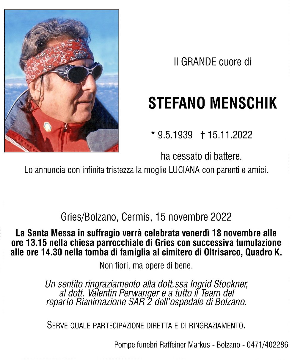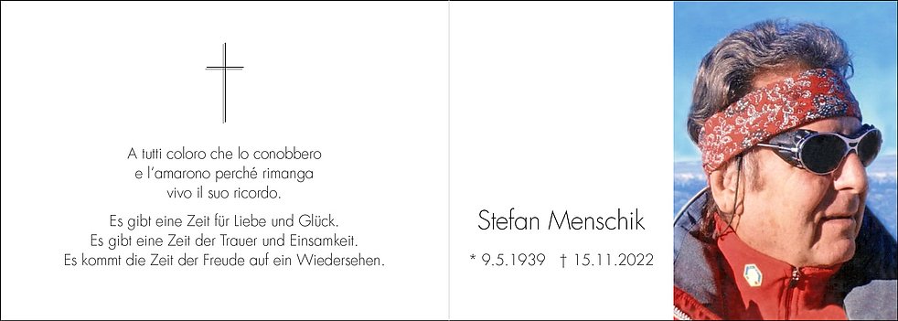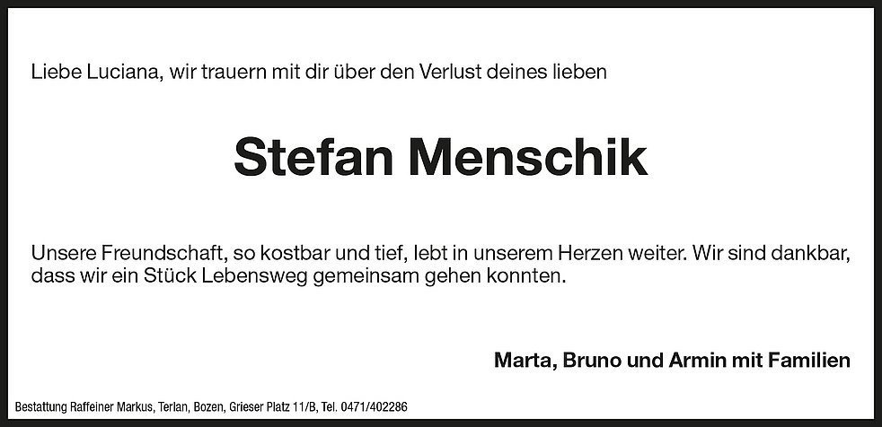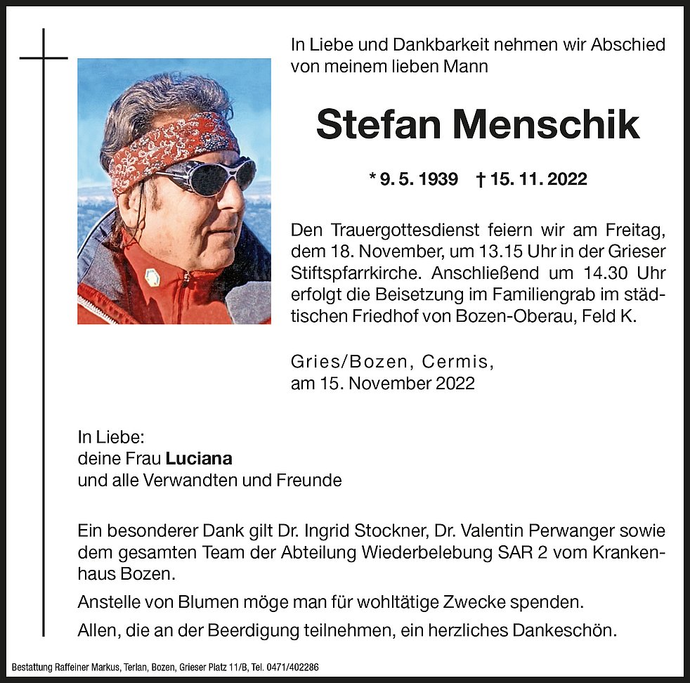 Den Trauergottesdienst feiern wir am Freitag, dem 18. November, um 13.15 Uhr in der Grieser Stiftspfarrkirche. Anschließend um 14.30 Uhr erfolgt die Beisetzung im Familiengrab am städtischen Friedhof von Bozen-Oberau, Feld K.