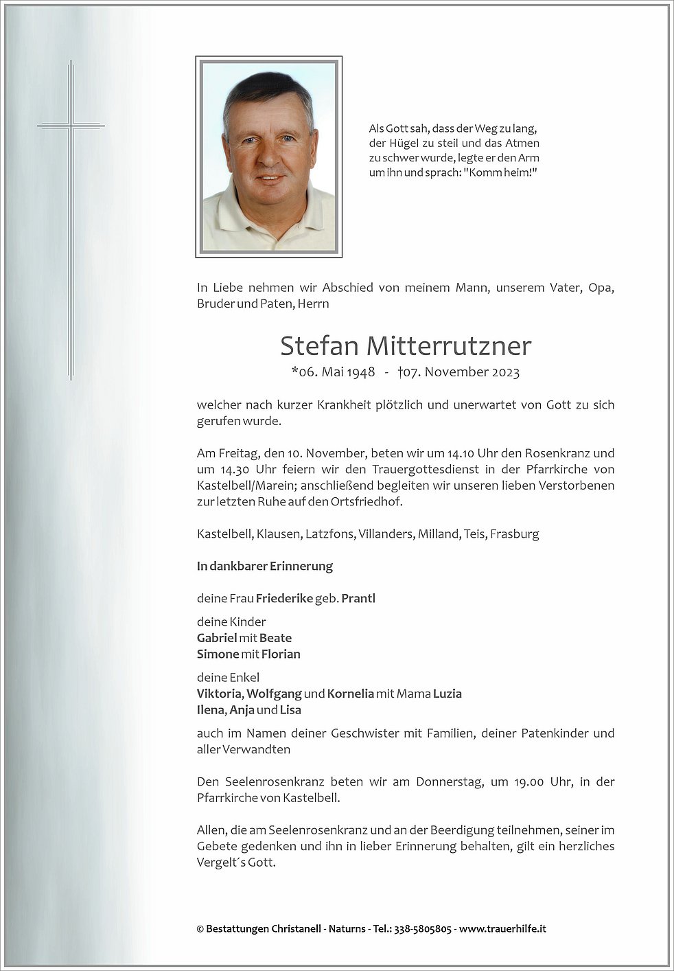 Am Freitag, den 10. November, beten wir um 14.10 Uhr den Rosenkranz und um 14.30 Uhr feiern wir den Trauergottesdienst in der Pfarrkirche von Kastelbell/Marein; anschließend begleiten wir unseren lieben Verstorbenen zur letzten Ruhe auf den Ortsfriedhof.