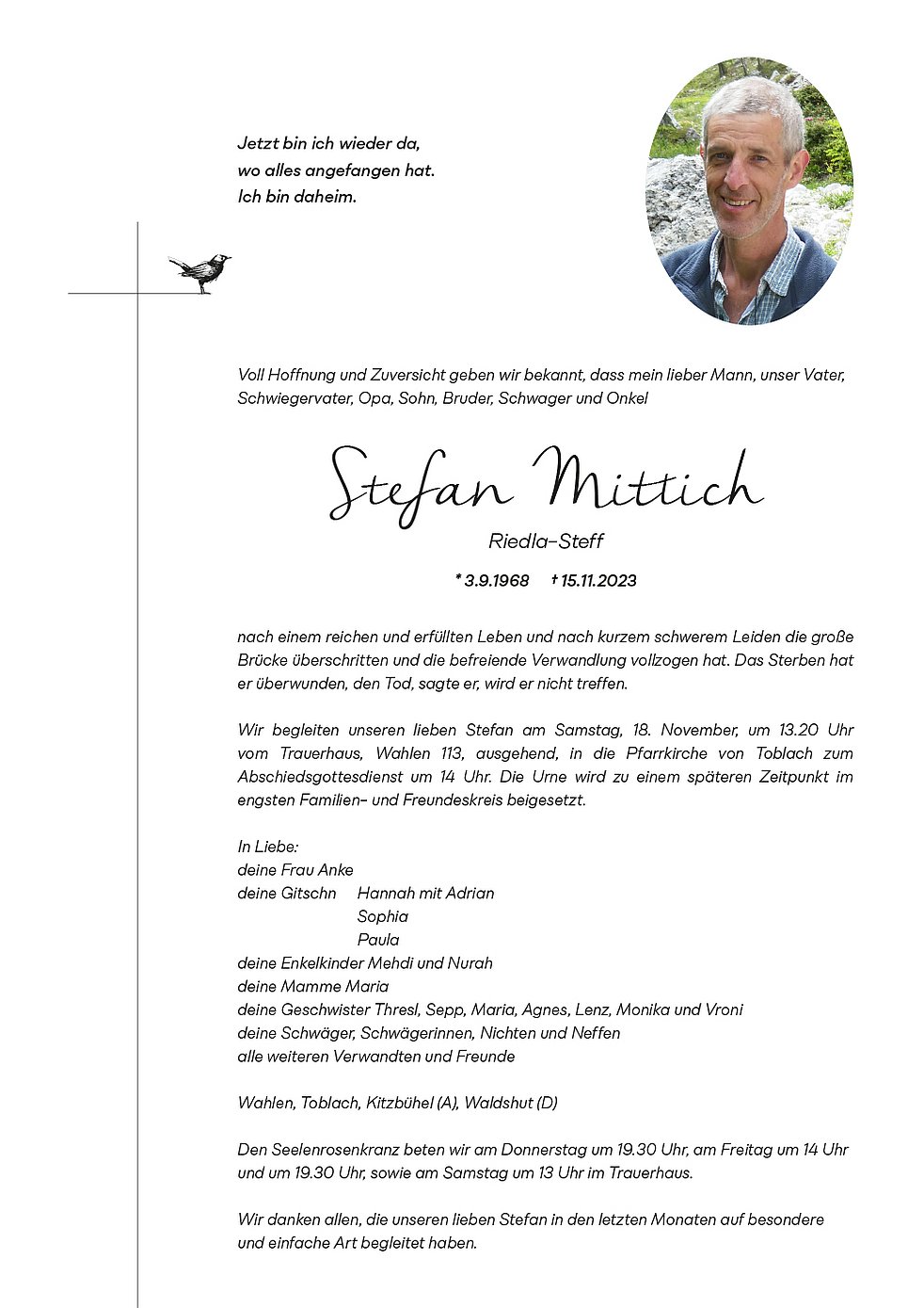 Aufrichtiges Beileid zum Heimgang Eures lieben Stefan. Ich habe Dr. Stefan Mittich persönlich nicht gekannt. Ich war tief beeindruckt von der Sendung am 24. August 2023 mit Heike Tschenett auf RAI Südtirol und vom Interview im Toblacher Infoblatt 2023/03. Besonders seine Worte zum Abschluss des Interviews habe ich in mein Herz geschrieben. Ich zitiere: Frage: Was machen wir in Ihren Augen denn falsch? Stefan Mittich: Es obliegt nicht mir, darüber zu urteilen, was alles falsch läuft auf dieser Welt. Ich möchte an dieser Stelle nur auf eine Gefahr hinweisen, der wir erliegen könnten: