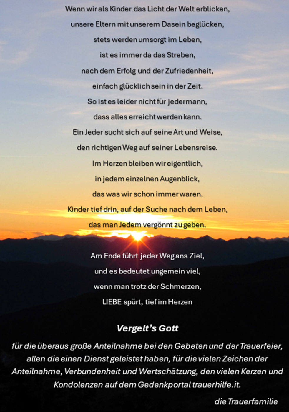 Unser lieber Stefan ist ab Dienstag in seinem Heimathaus Jörglmoarhof in Moos aufgebahrt. Dort begleiten wir ihn im Gebet am Dienstag um 19.30 Uhr.