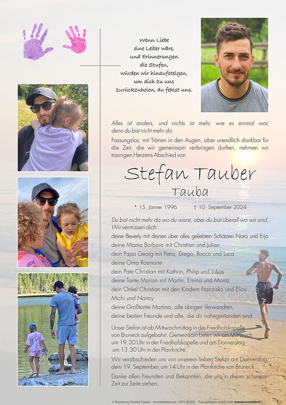 Unser Stefan ist ab Mittwochmittag in der Friedhofskapelle von Bruneck aufgebahrt. Gemeinsam beten wir am Mittwoch um 19.30 Uhr in der Friedhofskapelle und am Donnerstag