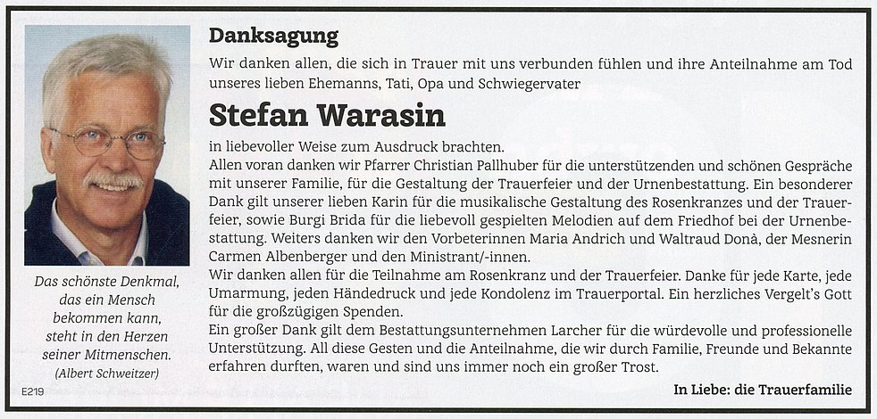 Allen, die am Rosenkranz und an der Trauerfeier teilnehmen, im Voraus ein herzliches Vergelt´s Gott.