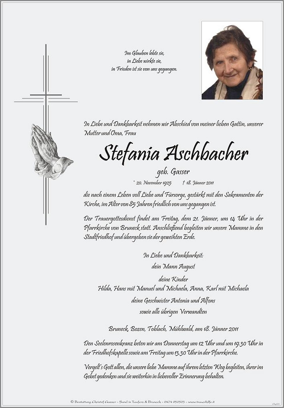 Der Trauergottesdienst findet am Freitag, dem 21. Jänner, um 14 Uhr in der Pfarrkirche von Bruneck statt. Anschließend begleiten wir unsere Mamme in den Stadtfriedhof und übergeben sie der geweihten Erde.