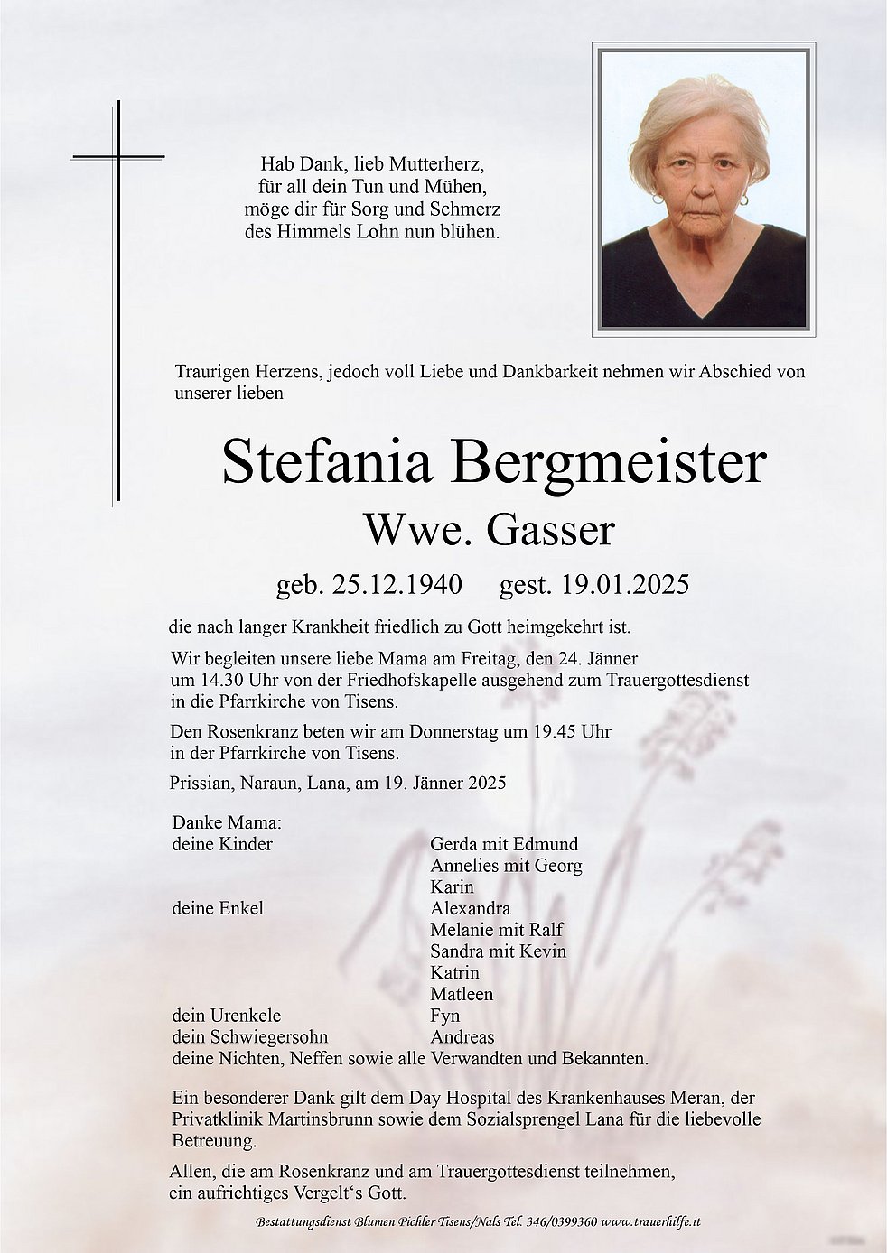 Liebe Oma niemand hot sich gedenkt dass du ins jetzt so schnell verlossen wersch weil mor gwisst hobm wie stark du worsch und leider hosch bis zu deinen wunsch nimmer gschofft wos no mehr schmerzhoft fir a poor isch i woas dass du probiert hosch olls zu tian und fin hem bin i dor ganz donkbar