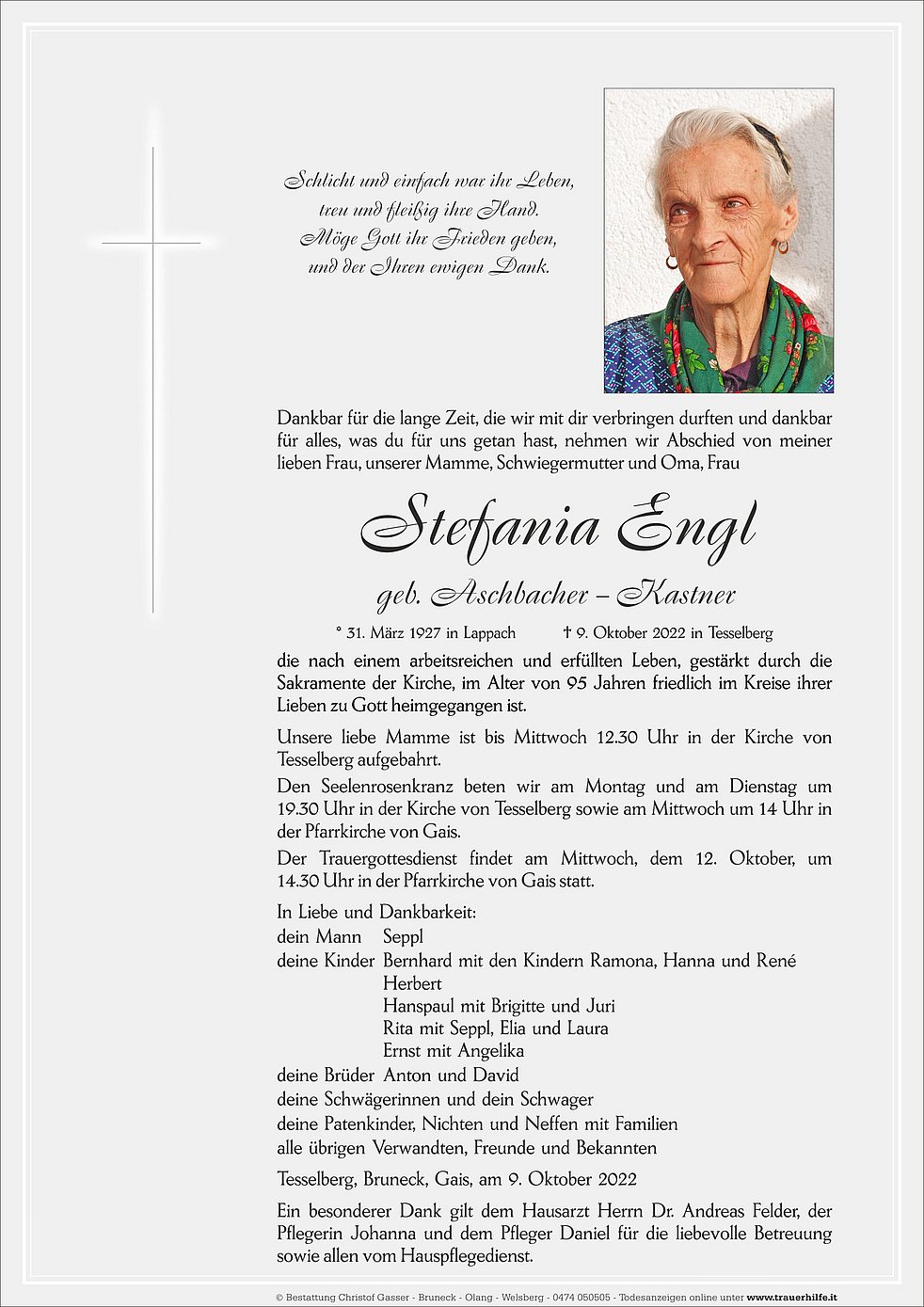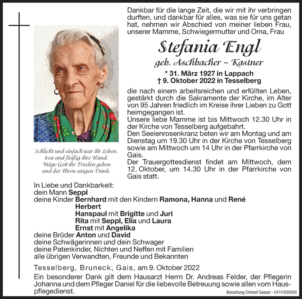 Der Trauergottesdienst findet am Mittwoch, dem 12. Oktober, um 14.30 Uhr in der Pfarrkirche von Gais statt.