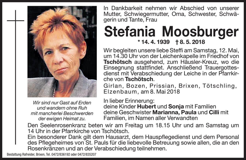 Wir begleiten unsere liebe Steffi am Samstag, 12. Mai, um 14.30 Uhr von der Leichenkapelle im Friedhof von Tschötsch ausgehend, zum Häusler-Kreuz, wo die Einsegnung stattfindet. Anschließend Trauergottesdienst mit Verabschiedung der Leiche in der Pfarrkirche von Tschötsch.