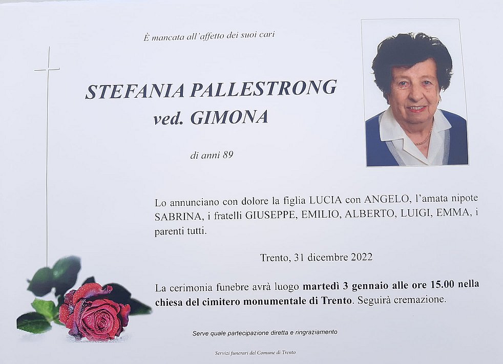 La cerimonia funebre avrà luogo martedi 3 gennaio alle ore 15.00 nella chiesa del cimitero monumentale di Trento.