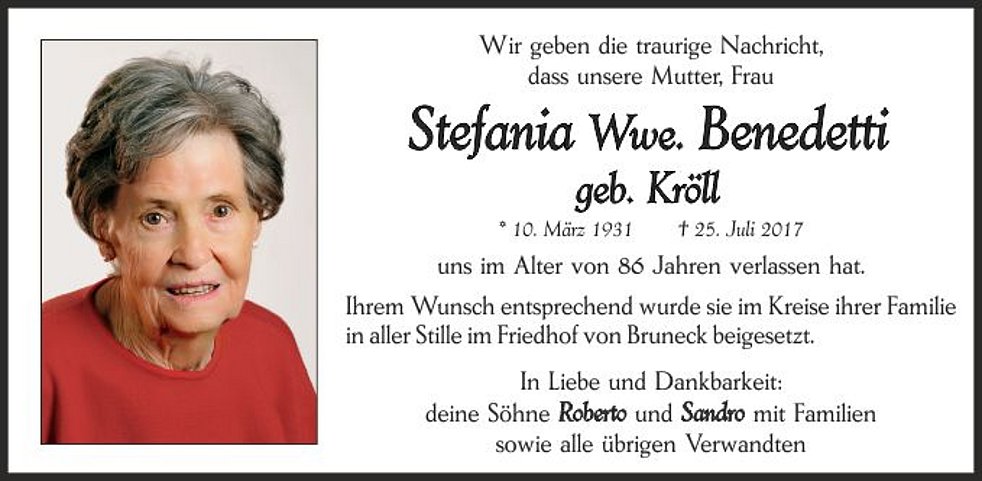 Ihrem Wunsch entsprechend wurde sie im Kreise ihrer Familie in aller Stille im Friedhof von Bruneck beigesetzt.