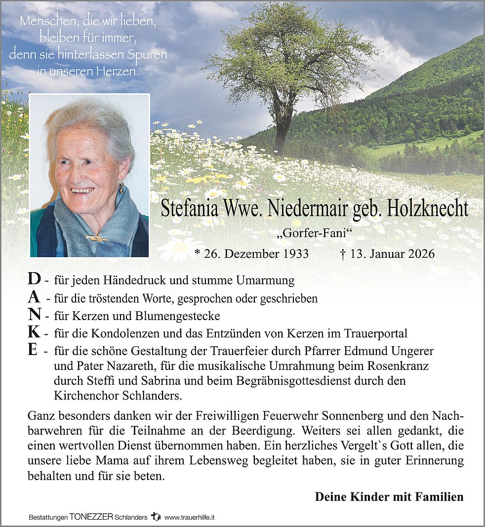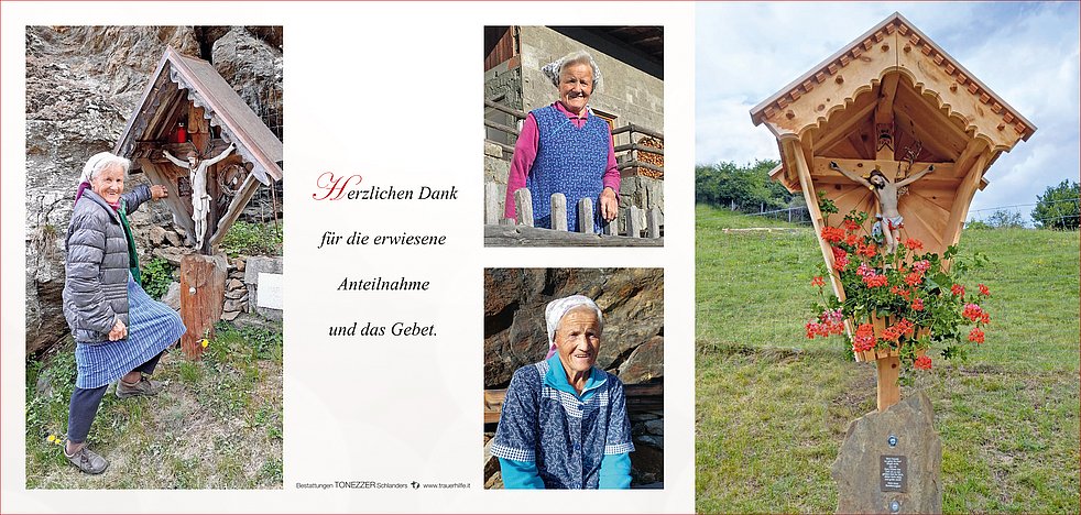 die im Alter von 92 Jahren, versehen mit den hl. Sakramenten der Kirche friedlich im Herrn entschlafen ist. Wir begleiten unsere liebe Mama am Donnerstag, 15. Januar, um 14 Uhr vom Sonnenberger-Totenkreuz ausgehend zum Begräbnisgottesdienst in die Pfarrkirche. Anschließend erfolgt die Beisetzung im Ortsfriedhof von Schlanders.